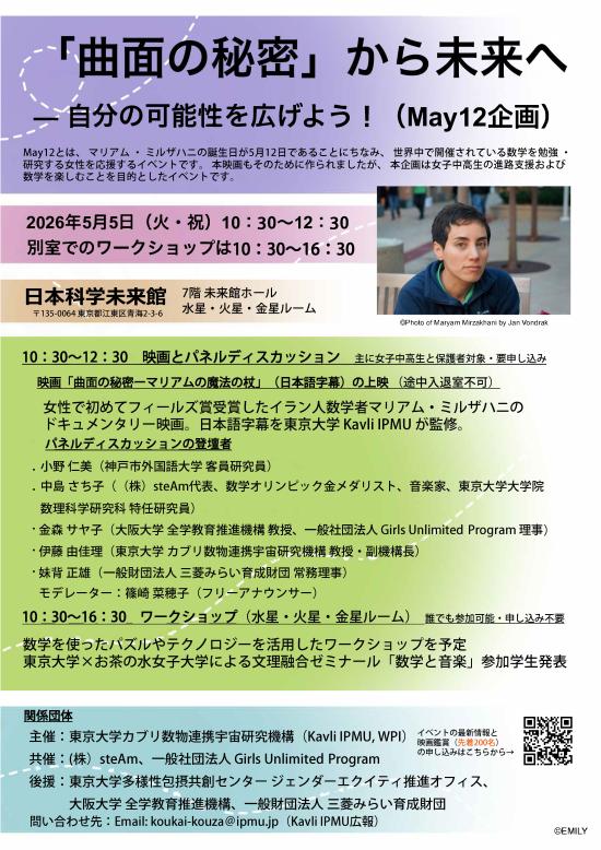 This May 5 (Tue, public holiday), The University of Tokyo Kavli Institute for the Physics and Mathematics of the Universe (Kavli IPMU, WPI), together with steAm Inc. and Girls Unlimited Program, will be co-hosting a career guidance event "From Secrets of the Surface and Beyond: Find Your Potential!"** at the National Museum of Emerging Science and Innovation (Miraikan) for junior high and high school girls, helping them discover the wonders of mathematics.