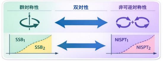 研究グループは、物理系の「双対性(duality)」に着目しました。双対性とは、一見異なる物理系が、実は数学的に等価な関係にあることを指します。研究グループは、双対変換を行うことで、「非可逆対称性を持つ SPT 相」が、「従来の群対称性が自発的に破れている相(SSB相)」と等価な関係(一対一対応)にあることを突き止めました(図1)。
