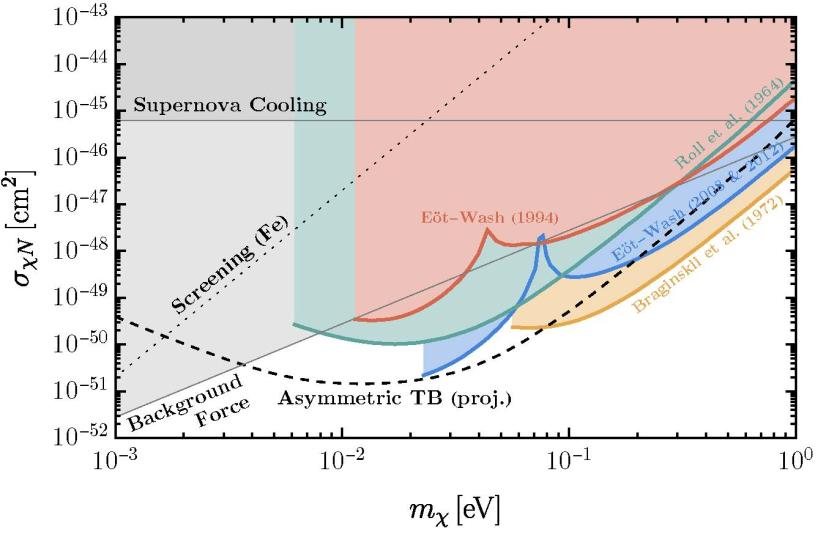 さらに研究グループは、慣性質量と重力質量が区別できないという等価原理検証に用いられてきた幾何学的に非対称な構造の「ねじり天秤」が、このような極めて軽いダークマターによる加速度に対して特に感度が高いことを示しました。いくつかの最先端のねじり天秤実験を体系的に分析し、もとは等価原理検証のために構築されたねじり天秤が、質量範囲約0.01~1eV の軽いダークマターと原子核との相互作用の強さに、現在最も強い制限を与え得ることを理論的に明らかにしたのです。