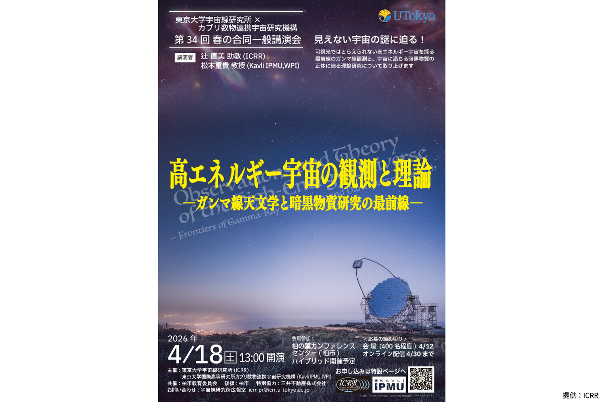 4月18日(土)ハイブリッド開催, 第34回Kavli IPMU・ICRR合同一般講演会「高エネルギー宇宙の観測と理論 ― ガンマ線天文学と暗黒物質研究の最前線」